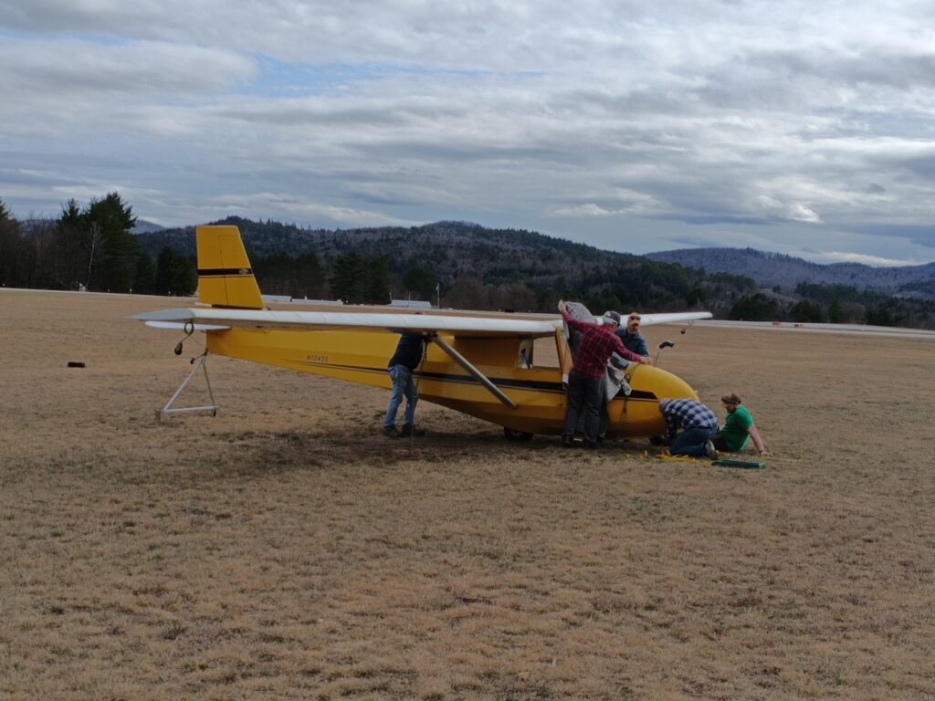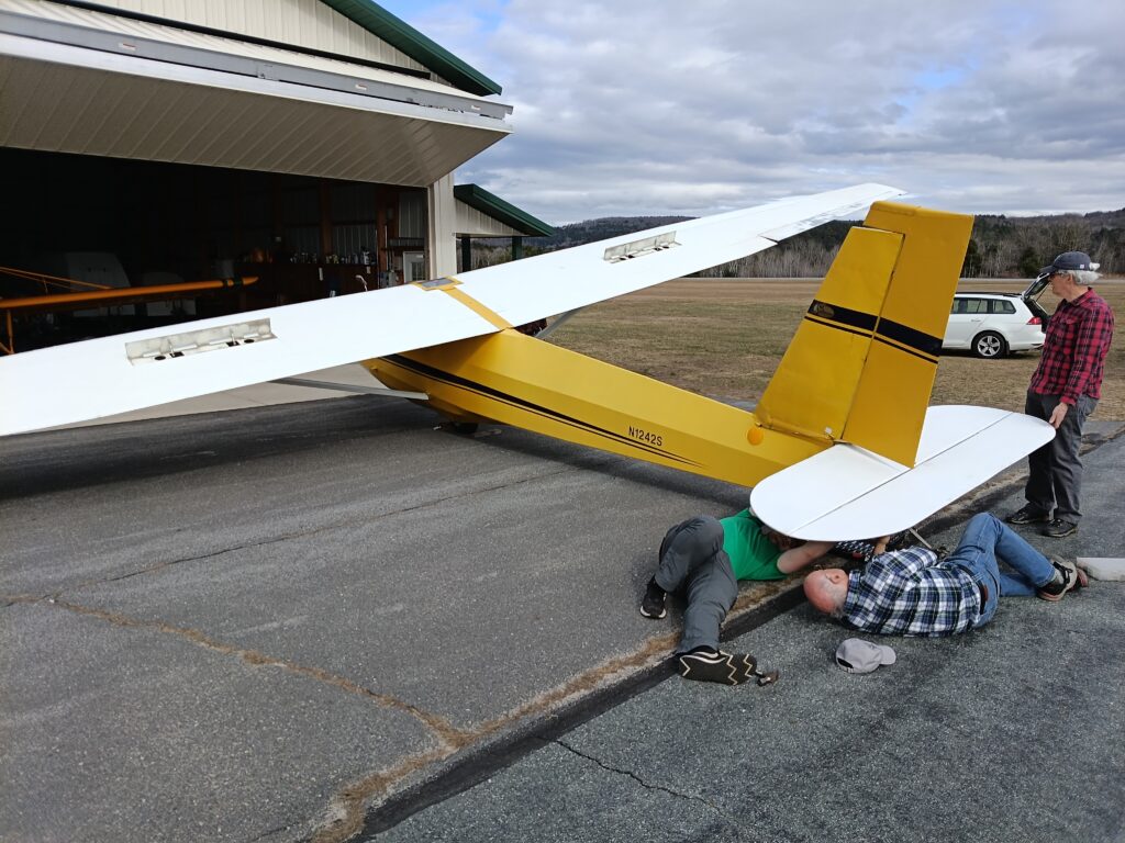 After the meeting several members stuck around to help with pre-season preparation. We got the first of the club ships (Yellow 2-33) re-assembled and back into the tie-down line. That helped make room in the hangar for the Callair Annual to continue (overhauled Mags are finally here). The 2-33 looked pretty lonely out there all on its own, but it won’t be very long until the rest of the fleet is back out there to keep it company.
